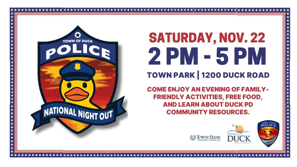 We are excited to announce that the Duck Police Department is bringing National Night Out to the Town! This annual community-building event is designed to strengthen partnerships between local law enforcement and the community, with the goal of making our neighborhoods safer and more connected.